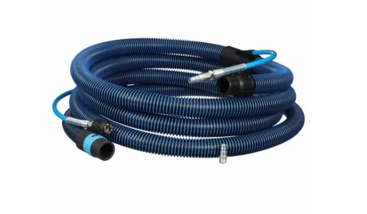 The 3M™ Antistatic Pneumatic Hose works with the 3M™ Clean Sanding System. The built-in air regulator collar allows the operator to adjust suction. The air hose is built into the vacuum hose to help reduce snagging, clutter and tangling. The 3M™ Antistatic Pneumatic Hose is designed for use with the 3M™ Clean Sanding System. The tool end of the hose includes an air regulator collar that allows the operator to adjust suction for tasks, like hand blocking, which may require reduced suction. The air hose is built into the vacuum hose to help reduce snagging, clutter and tangling. The high-flow air couplings help maintain pressure and airflow. A 5-m length allows for freedom of movement around the workpiece.